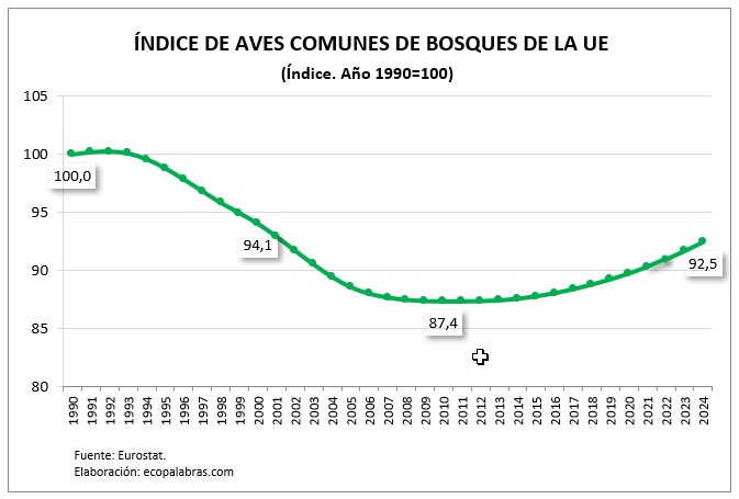 De forma complementaria al Índice de todas las Aves Comunes, Eurostat elabora otros dos índices compuestos. El primero, el índice de aves comunes de bosques, circunscrito a 34 especies, nos revela que se ha producido un descenso del 7,5% durante el periodo 1990-2024, al pasar de 100,0 a 92,5. Con este indicador se aprecia que sólo durante el último decenio se ha logrado una tendencia de recuperación parcial de estas aves tras los continuados descensos registrados hasta los años 2009-2013, cuando el índice registró sus valores mínimos.