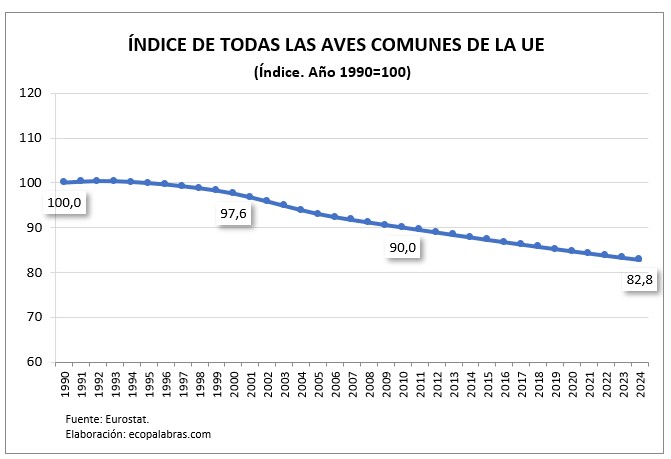 Se cuenta con un amplio horizonte temporal (1990-2024) para evaluar la tendencia de dicho Índice de Aves Comunes de la UE. Los resultados obtenidos hasta hoy apuntan que desde 1990 se ha producido una continuada disminución de las poblaciones de aves en la Unión Europea, lo que denota también un progresivo deterioro de los espacios naturales. Como se observa en el siguiente gráfico, dicho índice de aves ha descendido desde el valor 100,0 en el año base de 1990 hasta 82,8 en 2024, esto es, una caída del 17,2%