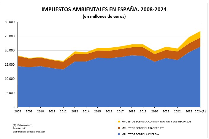 Desde una perspectiva temporal, durante el periodo 2008-2024 los impuestos ambientales han aumentado un 47,6%, al pasar de 18.179 a 26.830 millones de euros (en precios corrientes).