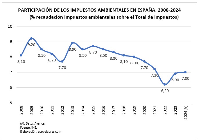 En términos relativos, si analizamos la implantación de la fiscalidad verde en España, se concluye que la participación de los impuestos ambientales ha perdido peso sobre el total de impuestos de España durante el periodo 2008-2024