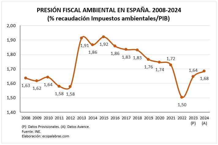 En el caso de España, los datos publicados por el Instituto Nacional de Estadística (INE) nos permiten conocer la importancia que las instituciones públicas otorga a la fiscalidad verde en este país. Según los datos avance del año 2024 la recaudación de los impuestos ambientales ascendió a 26.830 millones de euros. En términos relativos, dicha cuantía representa el 7,0% del total de impuestos de la economía española. Asimismo, la presión fiscal ambiental, esto es, la ratio de recaudación por impuestos ambientales sobre el Producto Interior Bruto (PIB) se situó en el 1,68% en 2024.
