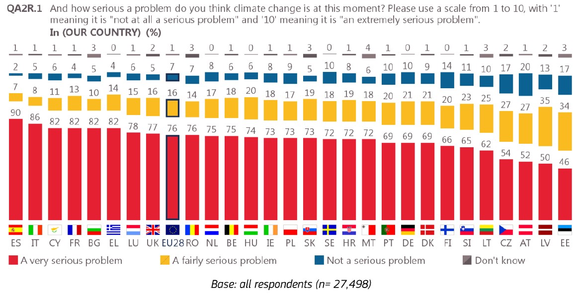 Respecto al cambio climático, el 76% de los europeos piensa que es un problema muy serio en su país, incluyendo un 31% que responde que es un problema extremadamente serio. En el otro extremo, sólo un 7% considera que no es un problema serio.