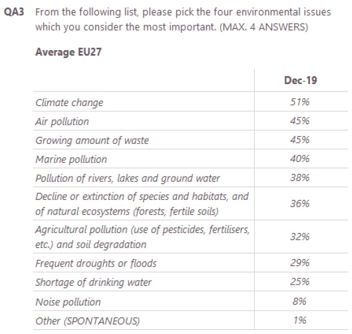 En el contexto europeo, la Comisión Europea llevó a cabo en diciembre de 2019 una importante encuesta a los ciudadanos de la Unión, que han sido publicados en su Eurobarómetro Especial Attitudes of European citizens towards the Environment (marzo de 2020). Esta importante consulta a la opinión pública, la quinta que se realiza desde 2007 en esta materia en la UE, nos aporta algunas conclusiones relevantes sobre las actitudes de los ciudadanos hacia el medio ambiente que es de especial interés tener muy presentes. A continuación se exponen tres resultados principales.