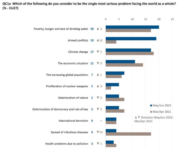 Ante la pregunta de cuál es el problema más grave al que se enfrenta el mundo en su conjunto, entre un total de once problemas enunciados los ciudadanos europeos encuestados respondieron que el cambio climático es el tercer problema global más serio, tras la pobreza, el hambre y la escasez de agua potable, y los conflictos armados.