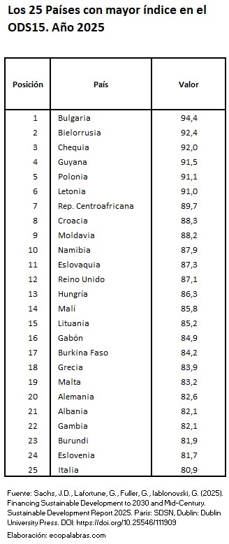 La edición del Informe de Desarrollo Sostenible 2025 de SDSN nos revela de forma aproximada cuál es la situación más actual del cumplimiento del objetivo de Vida de ecosistemas terrestres, país por país, y en qué grado se va alcanzando ante el horizonte temporal fijado para 2030.