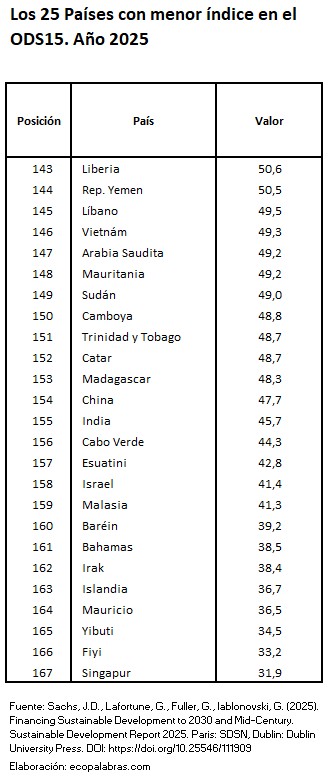 En un análisis más detallado, el Informe de 2025 nos permite conocer las puntuaciones obtenidas para el índice del ODS15 de cada uno de los 167 países para los que se dispone de datos.