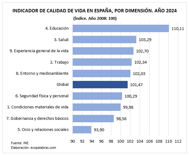 Analizando las nueve dimensiones que comprenden el IMCV, las más valoradas por la población española han sido Educación, Salud, Experiencia general de la vida, Trabajo y Entorno y medioambiente. Por el contrario, se sitúan por debajo de la puntuación media (101,47 puntos en 2024) las siguientes dimensiones: Ocio y relaciones sociales, Gobernanza y derechos básicos, Condiciones materiales de vida y Seguridad física y personal.