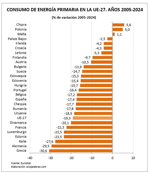 En un análisis por países, considerando el periodo de 2005-2024, se concluye que en el seno de la Unión Europea el consumo de energía primaria se ha reducido en 24 de los 27 Estados miembros, mientras que en los tres países restantes se ha incrementado.