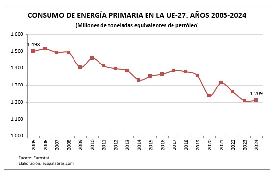 Analizando los últimos datos publicados por Eurostat, se concluye que el consumo total de energía primaria de la Unión Europea ascendió a 1.209 millones de toneladas equivalentes de petróleo (Mtep) en 2024, de modo que aumentó un 0,2% respecto al año anterior. Ello hace que respecto al objetivo marcado para 2030, el consumo energético siga siendo significativamente alto, en concreto un 21,8% más.