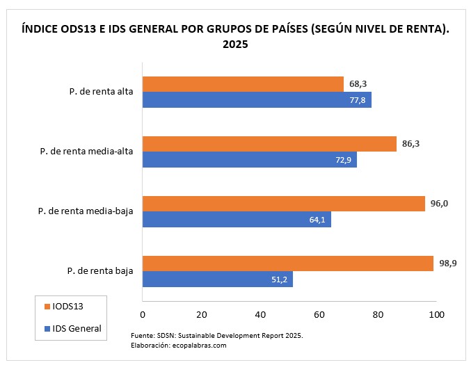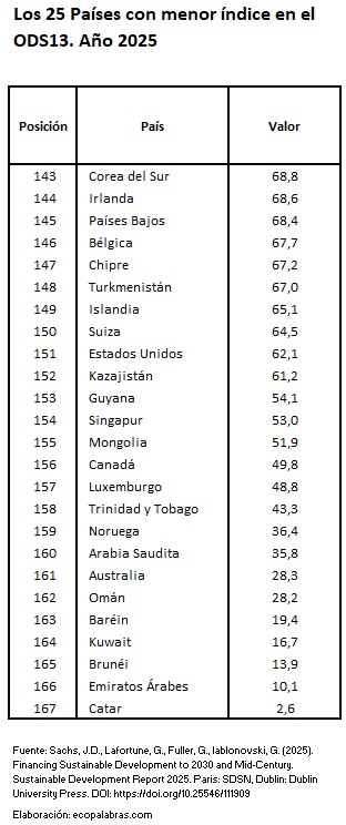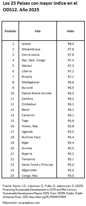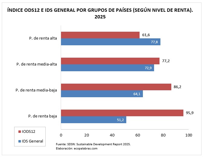 Por el contrario, la situación relativa más desfavorable respecto a la sostenibilidad de la producción y el consumo la presentan países que mayoritariamente disfrutan de un alto PIB per cápita: Luxemburgo (31,8), Irlanda (35,5), Catar (40,0), Dinamarca (41,7), Suiza (42,2), Estonia (43,6), Países Bajos (44,6), Lituania (46,9) y Singapur (47,0).
