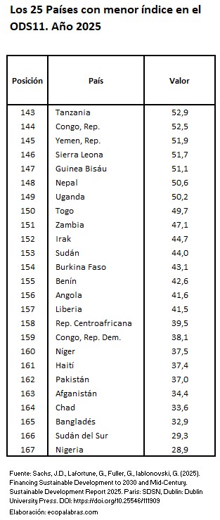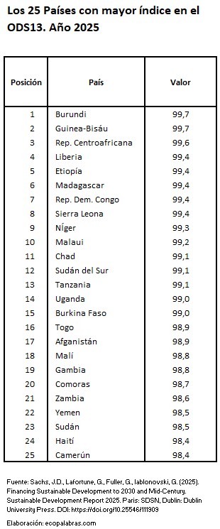 Por el contrario, la situación relativa más desfavorable respecto al cumplimiento del objetivo energético la presenta un amplio grupo de países pertenecientes al continente africano que cuentan con bajos niveles de renta per cápita, como son Chad (2,6), Sudán del Sur (13,6), Níger (15,1), Burundi (16,6), Sierra Leona (17,5), República Centroafricana (18,4) y Guinea-Bisáu (20,7). Para todos ellos siguen existiendo grandes desafíos para alcanzar las metas energéticas del ODS7 de aquí a 2030.