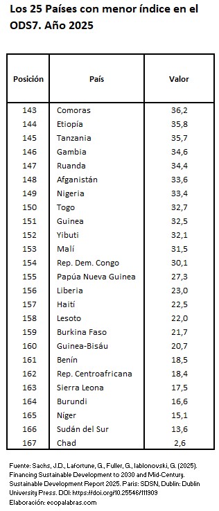 La edición del Informe de Desarrollo Sostenible 2025 de SDSN nos revela de forma aproximada cuál es la situación más actual del cumplimiento del objetivo de Energía asequible y no contaminante, país por país, y en qué grado se va alcanzando ante el horizonte temporal fijado para 2030.