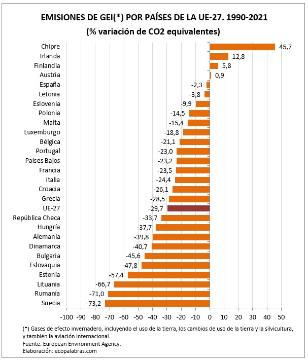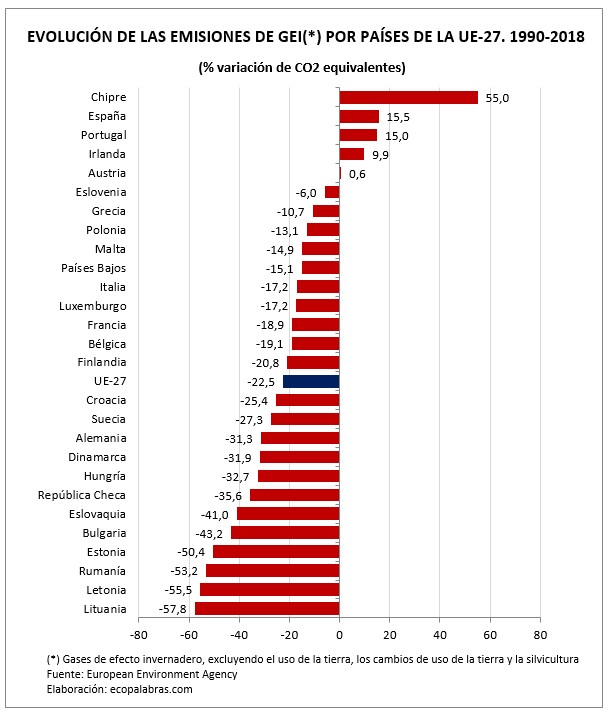 En términos absolutos, las mayores reducciones de emisiones se han anotado en la rama de suministro de energía eléctrica, gas, vapor, aire acondicionado y agua (54,0 millones de tCO2e menos) y en la industria manufacturera (-32,7 millones).