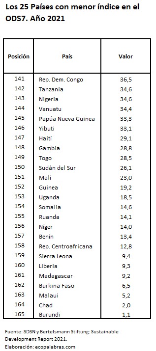 Por el contrario, la situación relativa más desfavorable respecto al cumplimiento del objetivo energético la presenta un amplio grupo de países pertenecientes al continente africano que cuentan con bajos niveles de renta per cápita, como son Chad (2,6), Sudán del Sur (13,6), Níger (15,1), Burundi (16,6), Sierra Leona (17,5), República Centroafricana (18,4) y Guinea-Bisáu (20,7). Para todos ellos siguen existiendo grandes desafíos para alcanzar las metas energéticas del ODS7 de aquí a 2030.