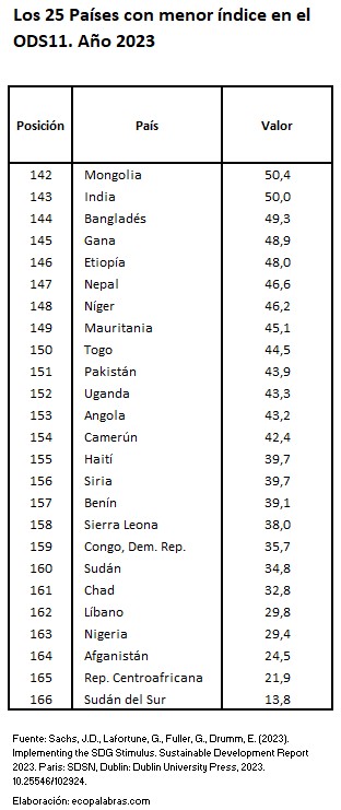 Por el contrario, la situación relativa más desfavorable respecto al grado de sostenibilidad de las ciudades y comunidades recae, un año más, sobre Nigeria (28,9) y Sudán del Sur (29,3). Les siguen, también con muy bajas puntuaciones, inferiores a 40, Bangladés (32,9), Chad (33,6), Afganistán (34,4), Pakistán (37,0), Haití (37,4), Níger (37,5), República Democrática del Congo (38,1) y República Centroafricana (39,5). Para todos ellos, de acuerdo con el Panel de control de los ODS, el ODS11 permanece «en rojo», es decir, persisten grandes desafíos para su cumplimiento de aquí a 2030.
