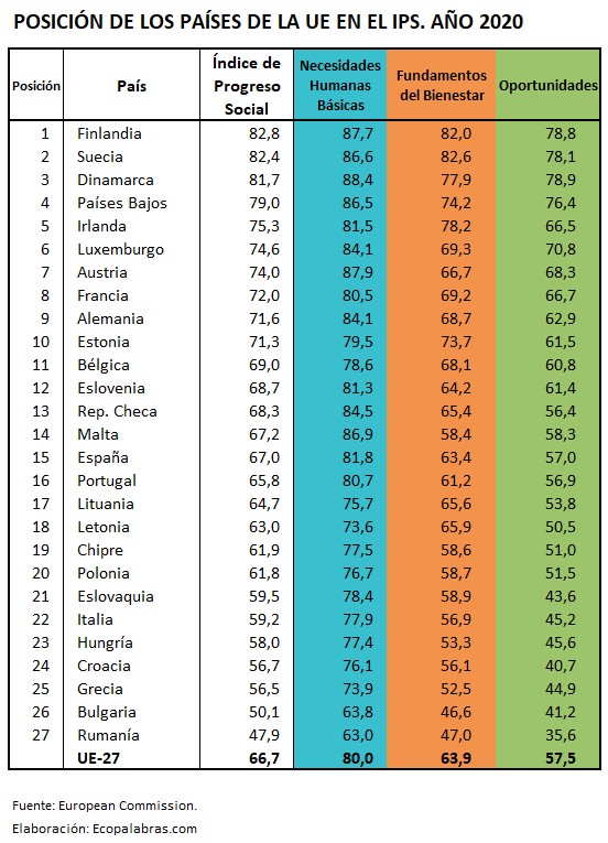 Tras una primera edición de 2016, los últimos datos del Índice de Progreso Social de la UE son los publicados en el año 2020. En una primera valoración de los resultados por países del IPS-UE de 2020, destacamos, a continuación, las siguientes conclusiones: