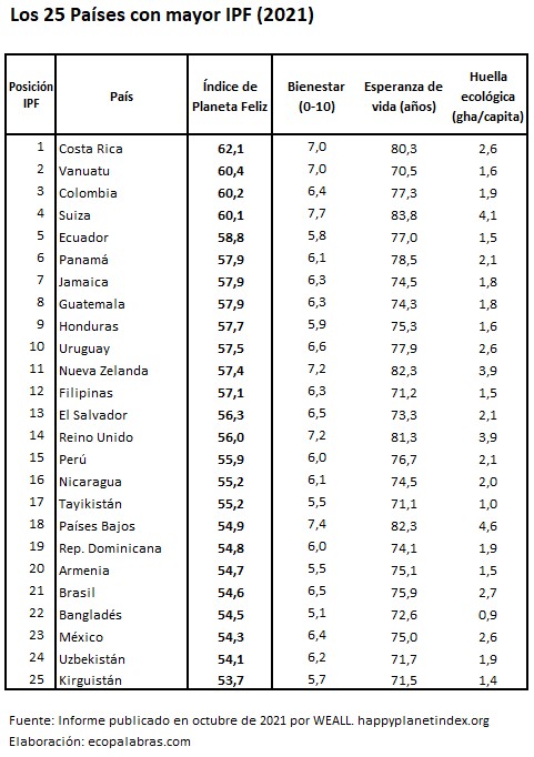 En la primera posición se sitúa Costa Rica (con un valor del IPF de 62,1). Con un nivel de bienestar y una esperanza de vida relativamente altos, que superan incluso a los de algunas naciones «ricas», y una huella ecológica inferior a la media, Costa Rica ha conseguido mantener su destacada posición a lo largo del tiempo.
